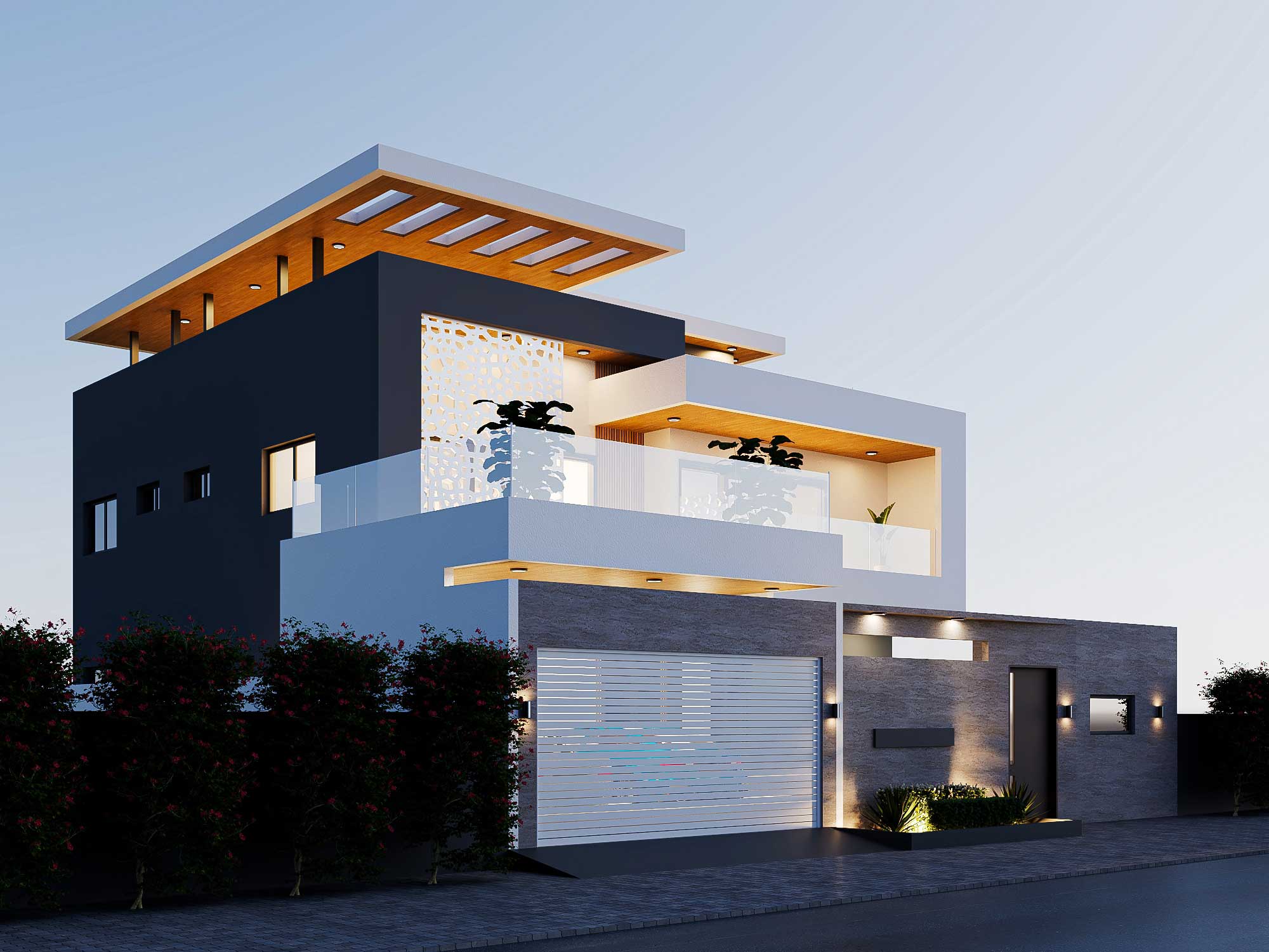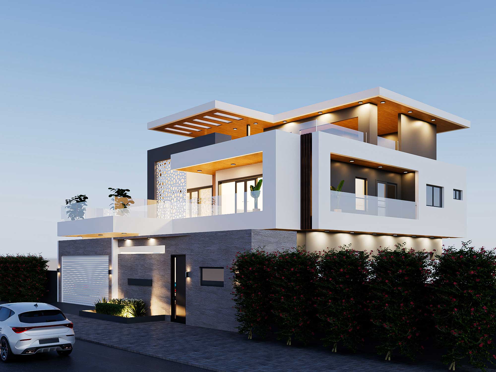 Ce duplex est conçu sur une parcelle de 320 m² avec un design épuré et des matériaux modernes. A l’étage on dispose d’une grande terrasse avec des garde-corps en vitrés, offrant une vue dégagée. Des plantes en pot ajoutent une touche de verdure. Le salon et la chambre principale au R+1 disposent de grandes baies vitrées pour profiter de la lumière naturelle et d’une belle vue. Un panneau décoratif ajouré permet de filtrer la lumière pour la chambre principale. Le duplex possède en tout 5 chambres avec salles de bain, 2 salons, une salle à manger,une cuisine avec un magasin, un bureau, un garage, une guérite et une toilette extérieur.