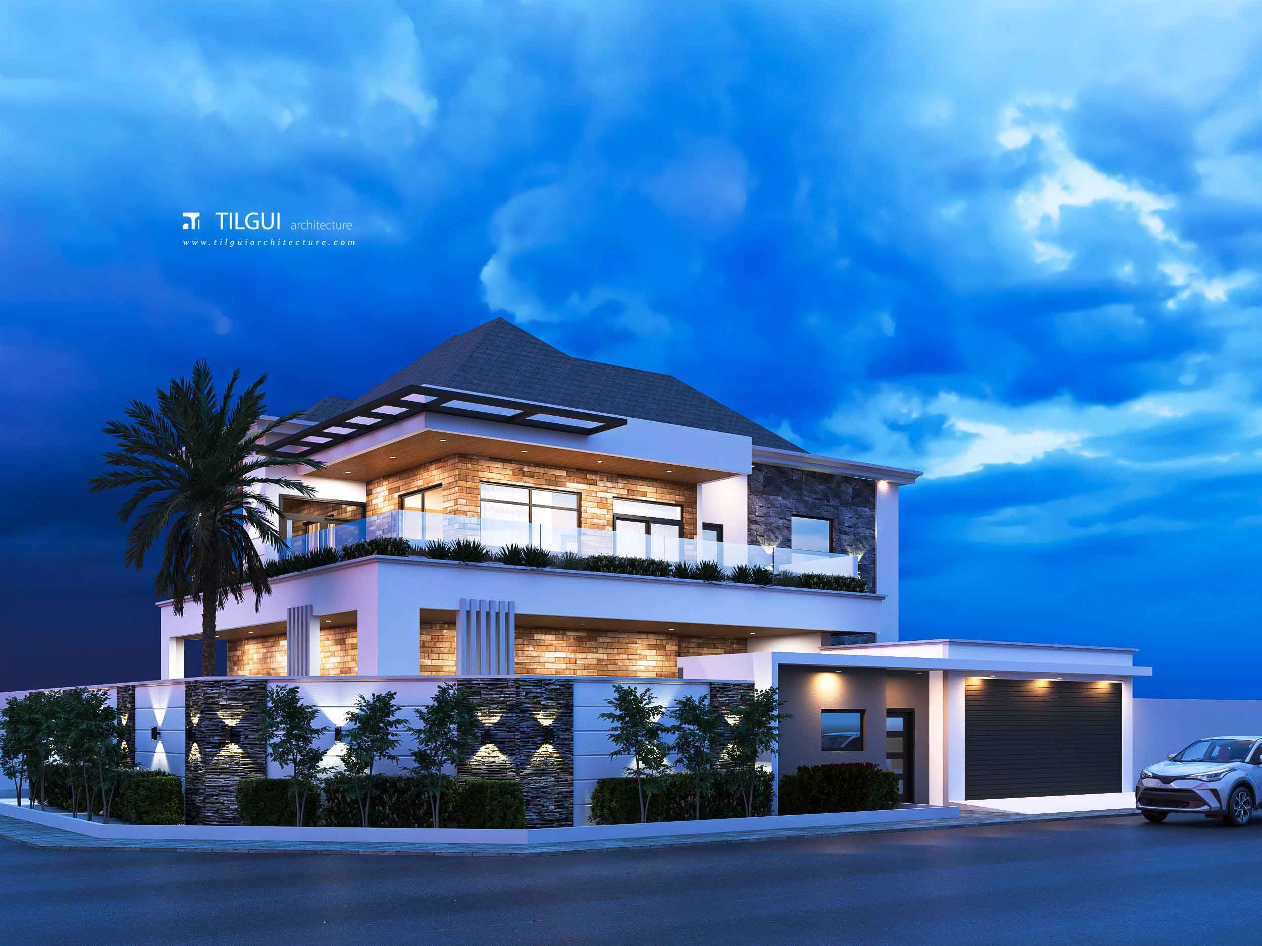 Ce duplex moderne conçu pour une parcelle de 304 m² à Ouaga 2000 combine les formes épurées de l’architecture moderne avec une toiture à pans multiples. Son salon, avec ses grandes baies vitrées, donne sur un jardin bien aménagé avec une piscine.